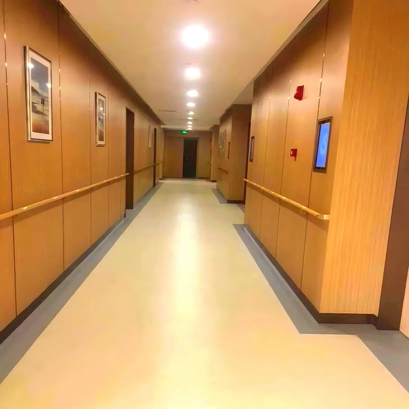 橡胶地板在受力时会产生轻微的形变,为脚掌提供自然的缓冲,减轻下肢关节的压力。当老人不慎滑倒时,地板的柔软质感也能降低磕碰带来的伤害,相较于硬质地面更具保护性,这种温和的支撑力尤其适合需要长期休养的人群。 静音效果为疗养院营造出安静的休养氛围。疗养空间需要保持相对安静的环境,以利于居住者的休息与康复。橡胶地板本身具有一定的隔音属性,能吸收行走、移动桌椅时产生的声响。老人在房间内活动或护理人员进行日常照料时,地面不会传出刺耳的摩擦声或撞击声,避免对他人造成干扰,让整个疗养环境更显静谧平和。耐脏易打理的特性减轻了疗养院的清洁负担。橡胶地板表面光滑且不易吸附灰尘,日常清洁时只需简单擦拭即可保持整洁。塑料地板